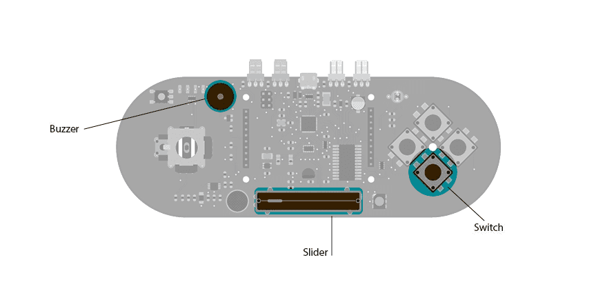 In this example, you move the slider to generate different notes, and play them by pressing the down push-button.